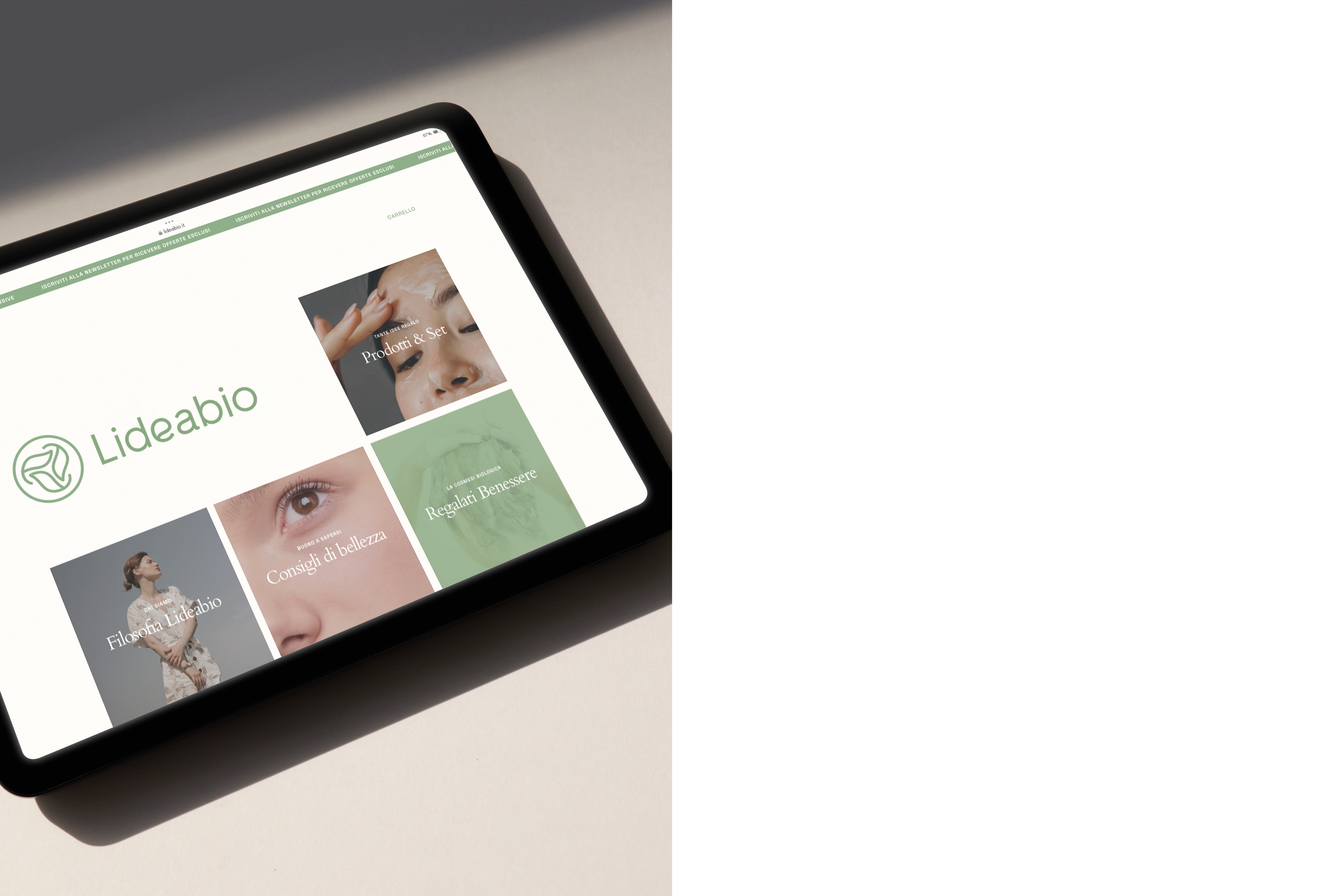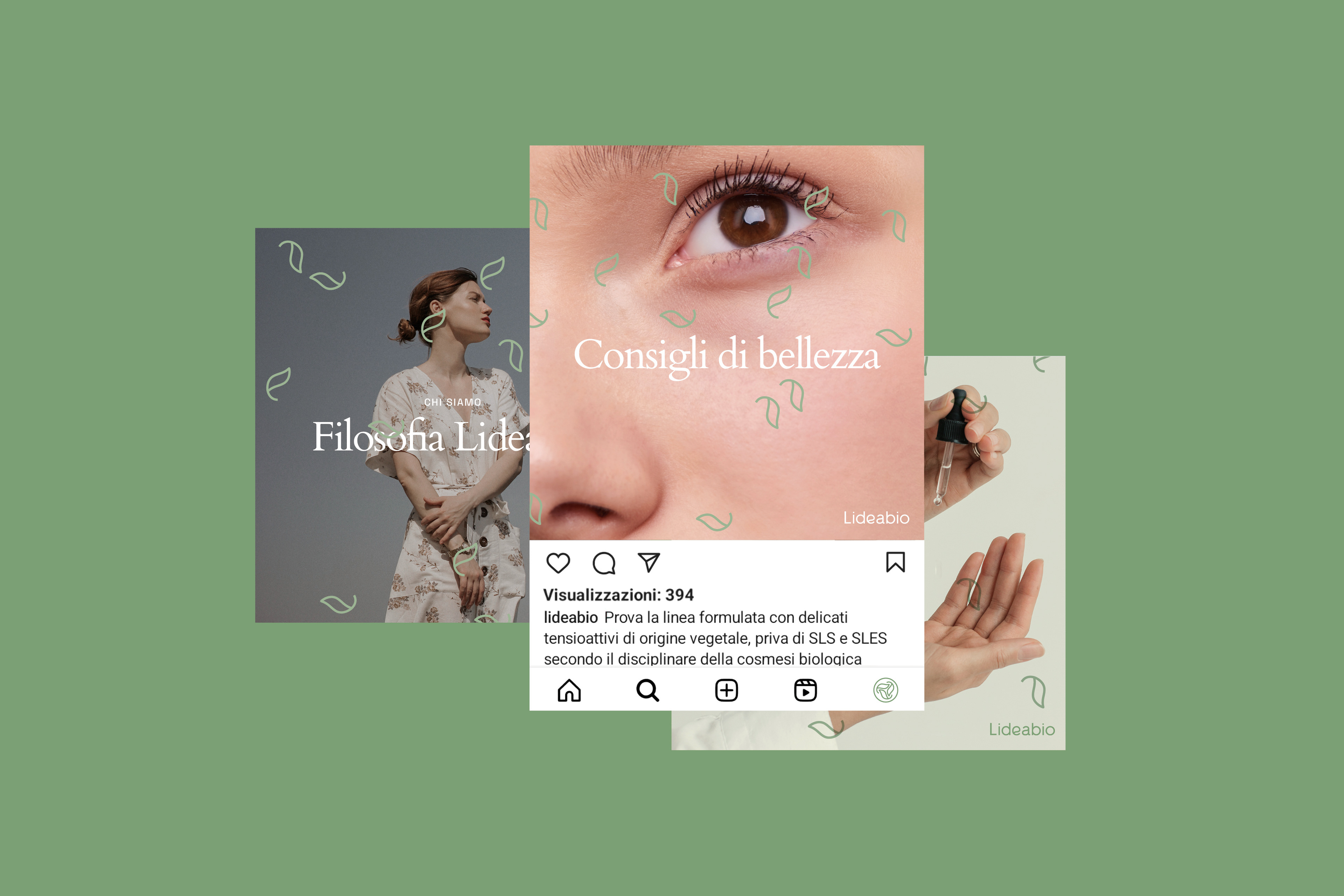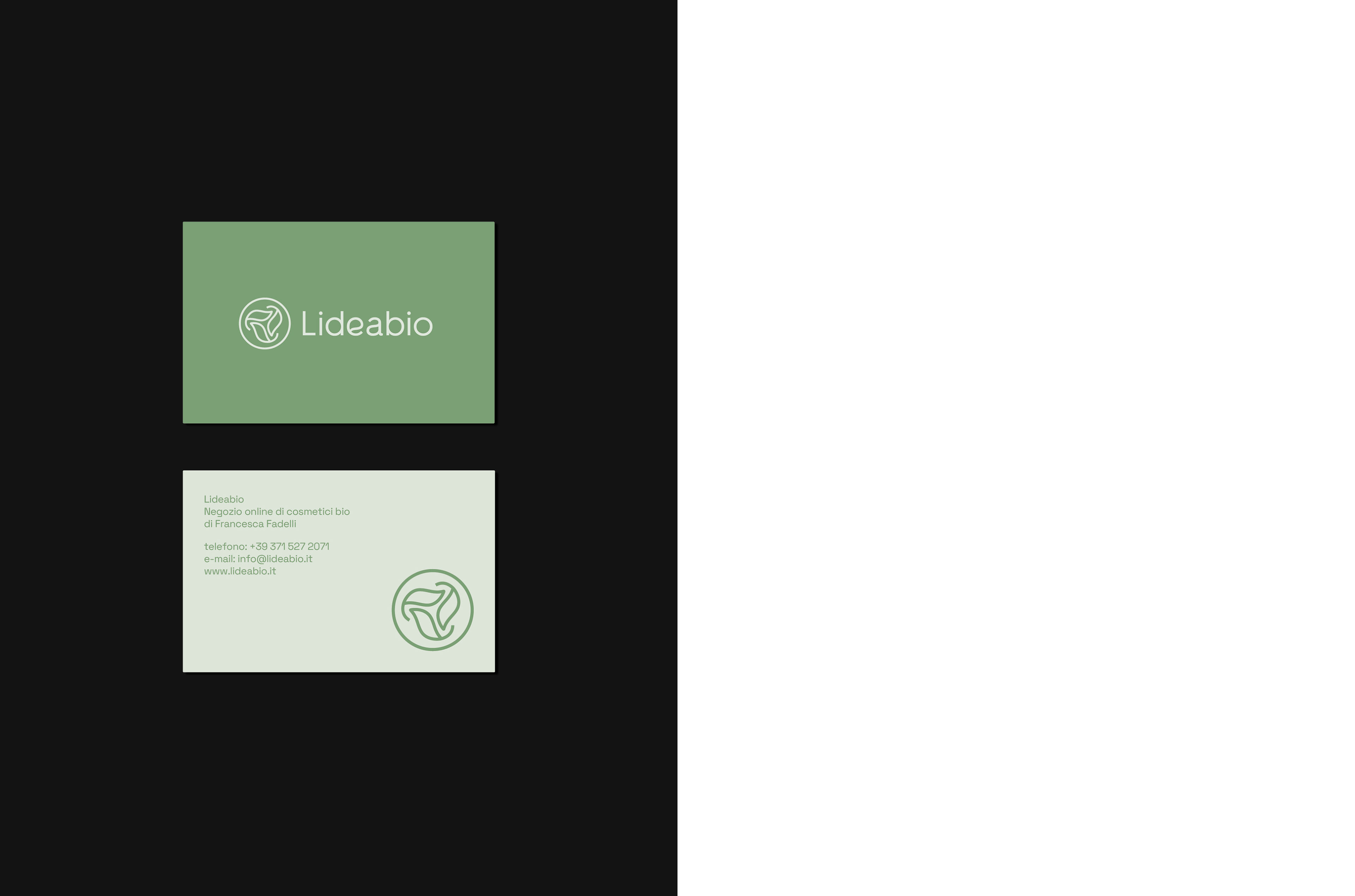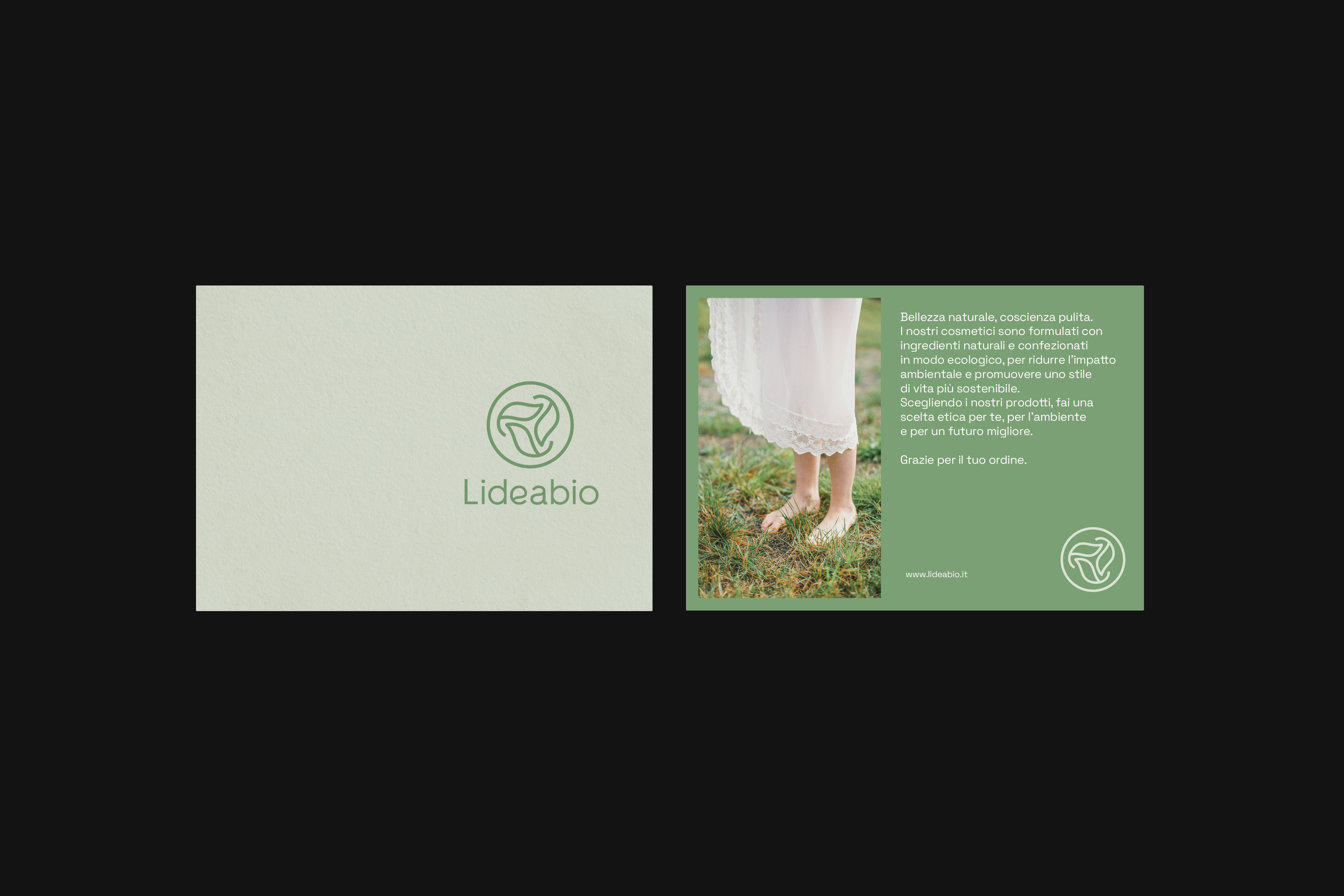 Marchio e identità visiva per Lideabio, e-shop di cosmesi naturale e biologica: cartolina, etichette e nastro adesivo, biglietti da visita ed esplorazioni.